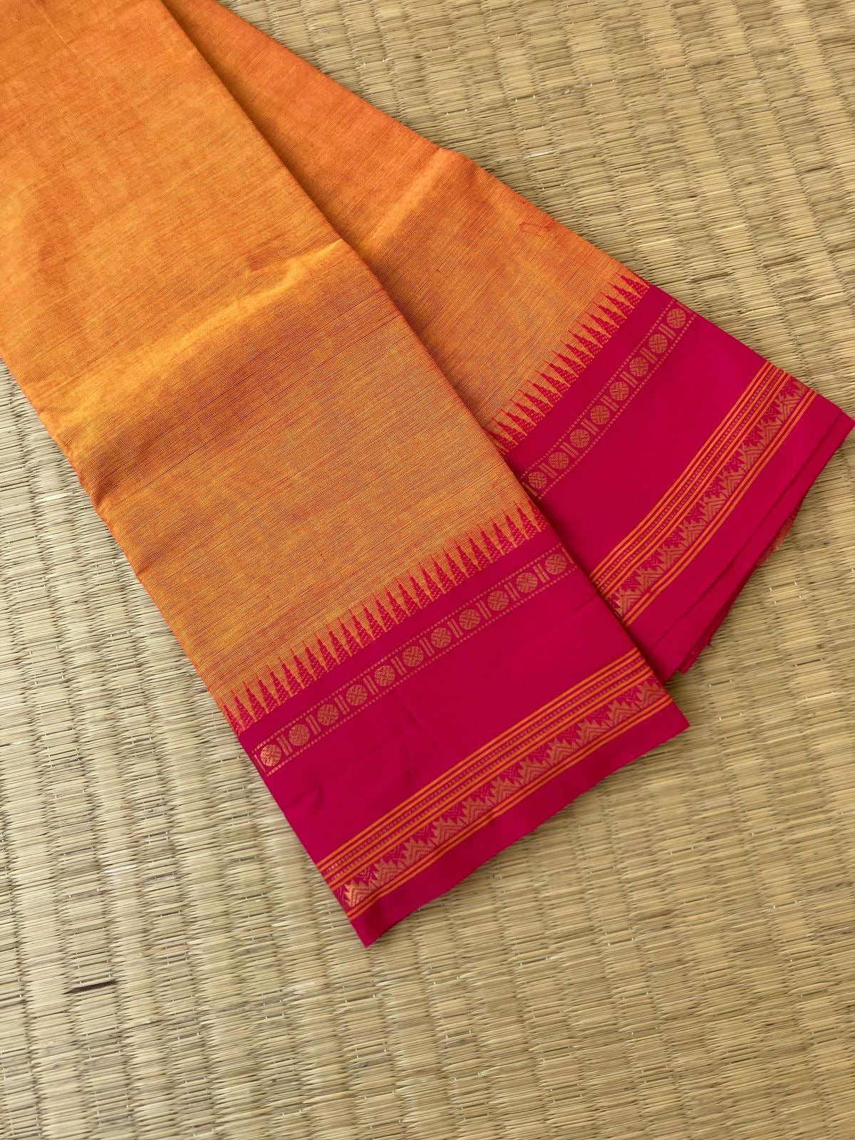 These saree comes with beautiful kanchivaram style gold/ Copper woven zari borders on chettinad cotton . With simple and elegant strips weaved pallu. These sarees are a fusion of Chettinad Cottons sarees with Kanchivaram style zari woven ganga jammuna borders