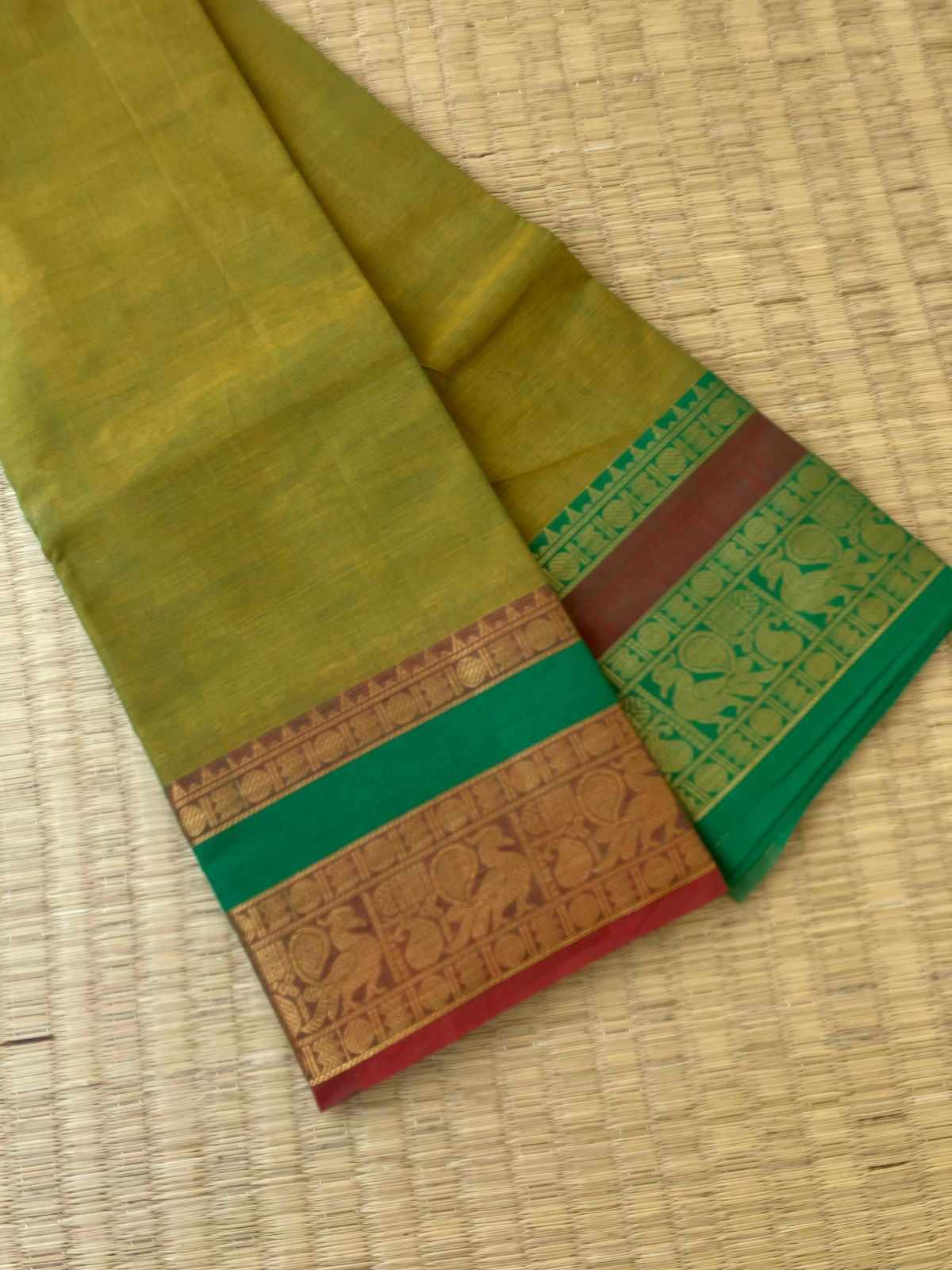 These saree comes with beautiful kanchivaram style gold/ Copper woven zari borders on chettinad cotton . With simple and elegant strips weaved pallu. These sarees are a fusion of Chettinad Cottons sarees with Kanchivaram style zari woven ganga jammuna borders