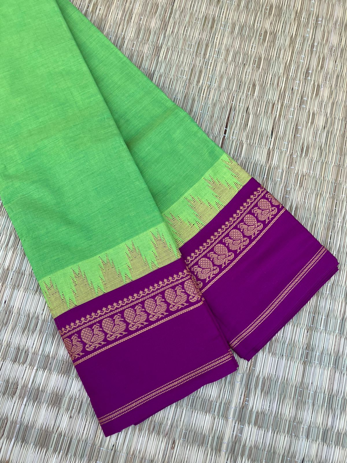 This saree comes without blouse (5.5 meters). Temple borders saree are a blockbuster weaves of chettinad. The pallu is woven with simple strips. Which adds a charm to the elegant drape.