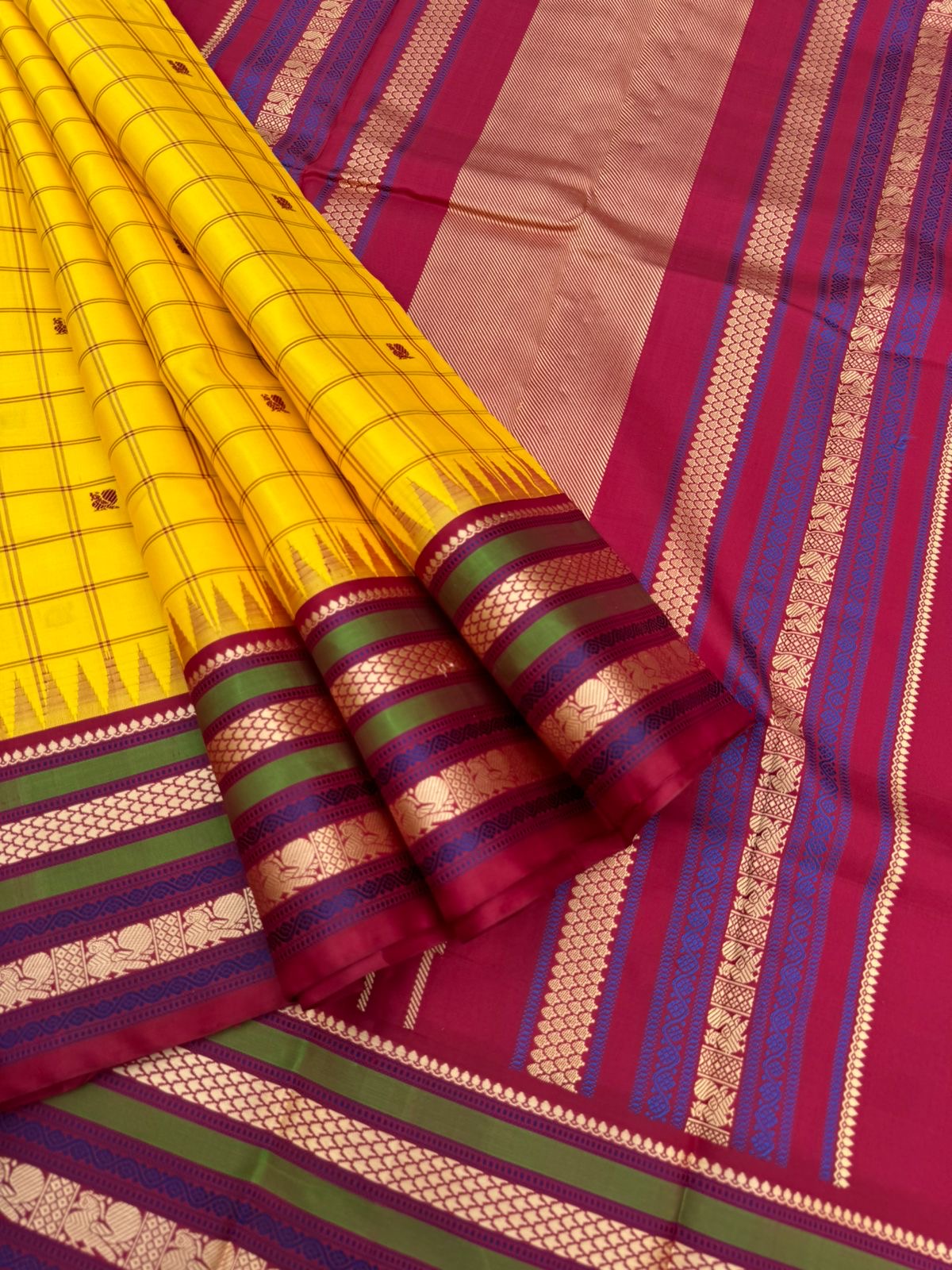 The Best of No Zari Korvai Kanchivaram - the most traditional yellow and aaraku with all traditional Kanchivaram elements kattam buttas Korvai everything