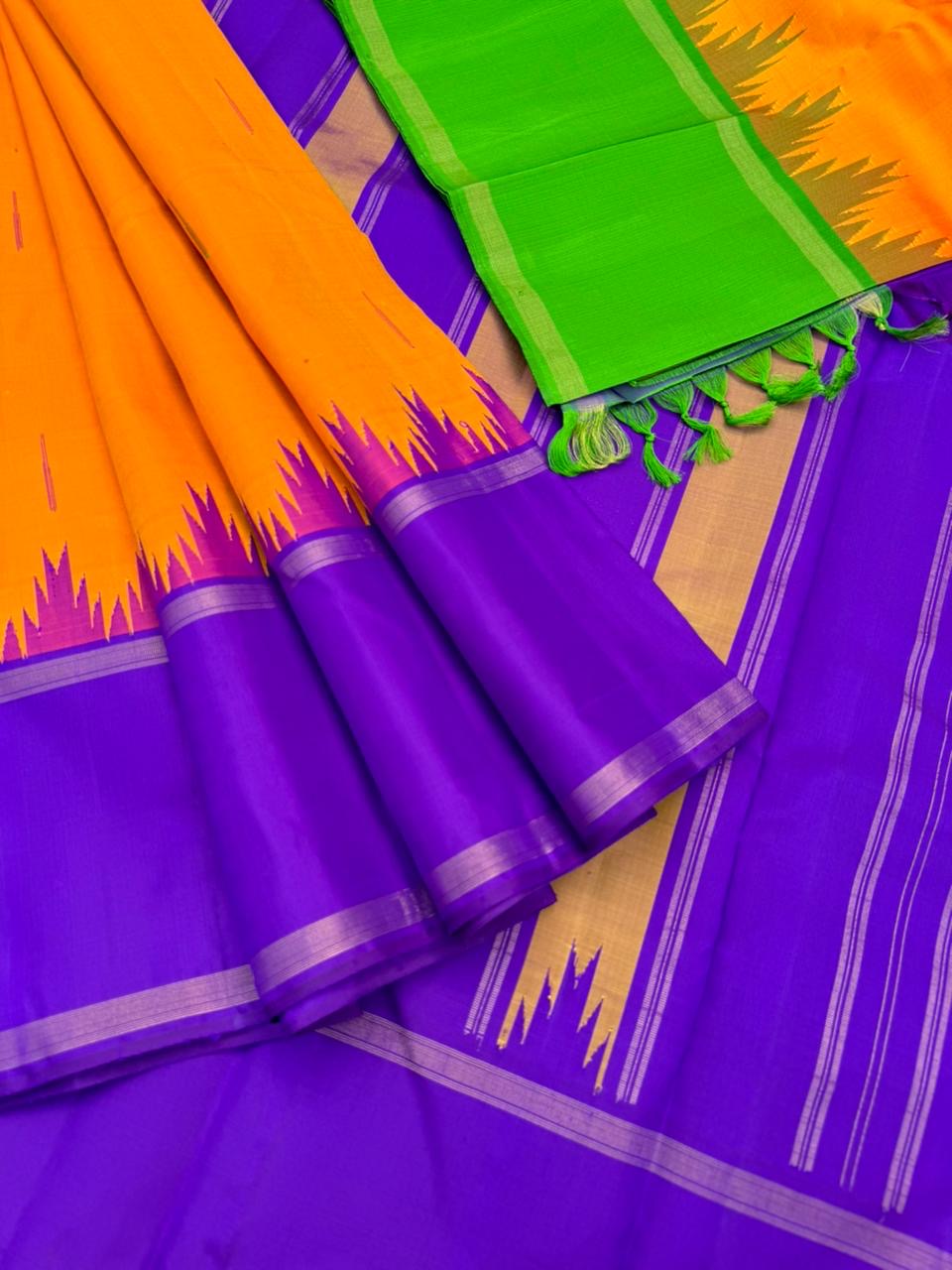 The Best of No Zari Korvai Kanchivaram - beautiful sun set orange with ganga jammuna Korvai borders with rain drop woven buttas