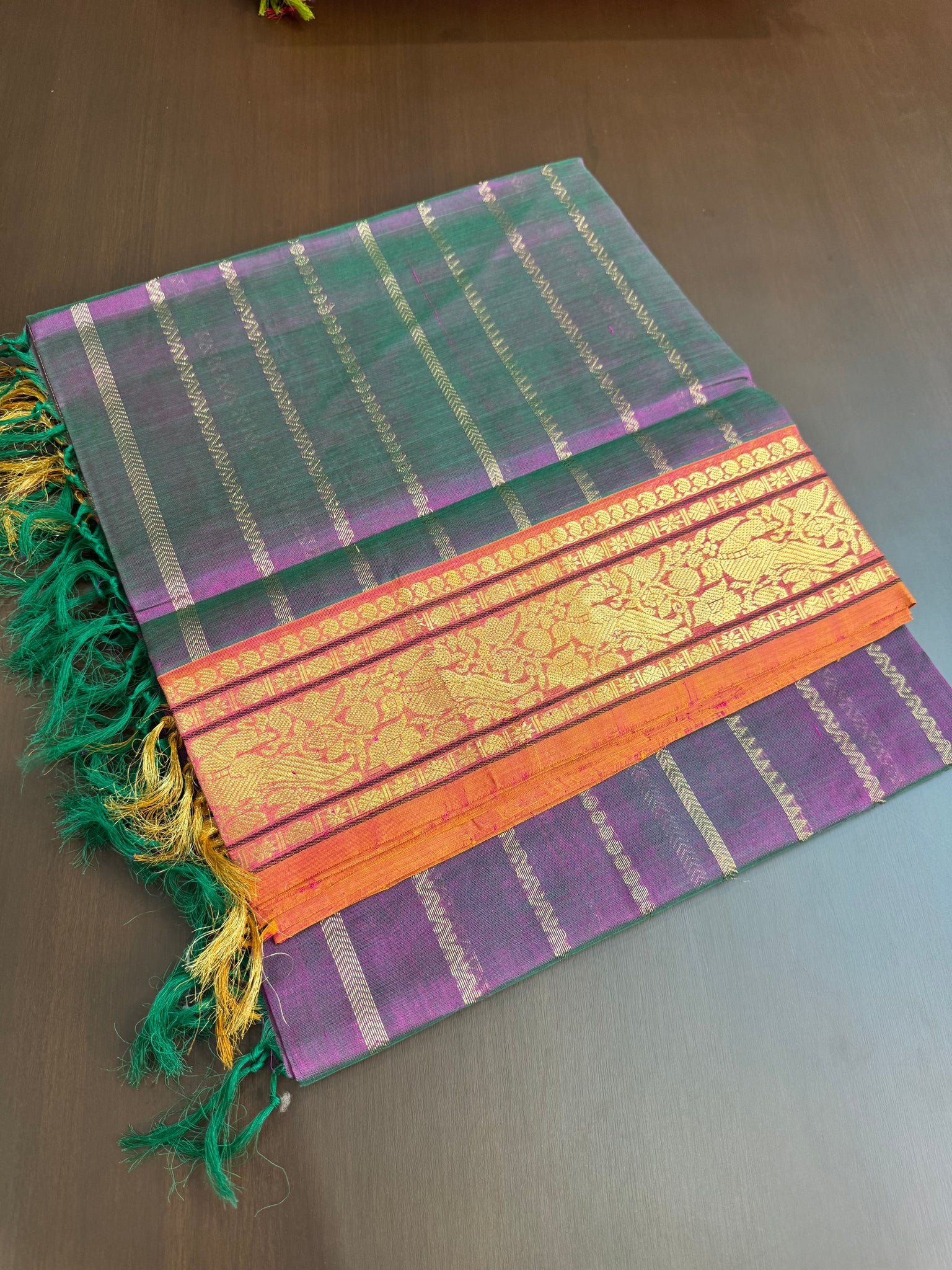 Vertical Veldhari on Zari Kissed Silk Cotton - dual tone green mixed violet