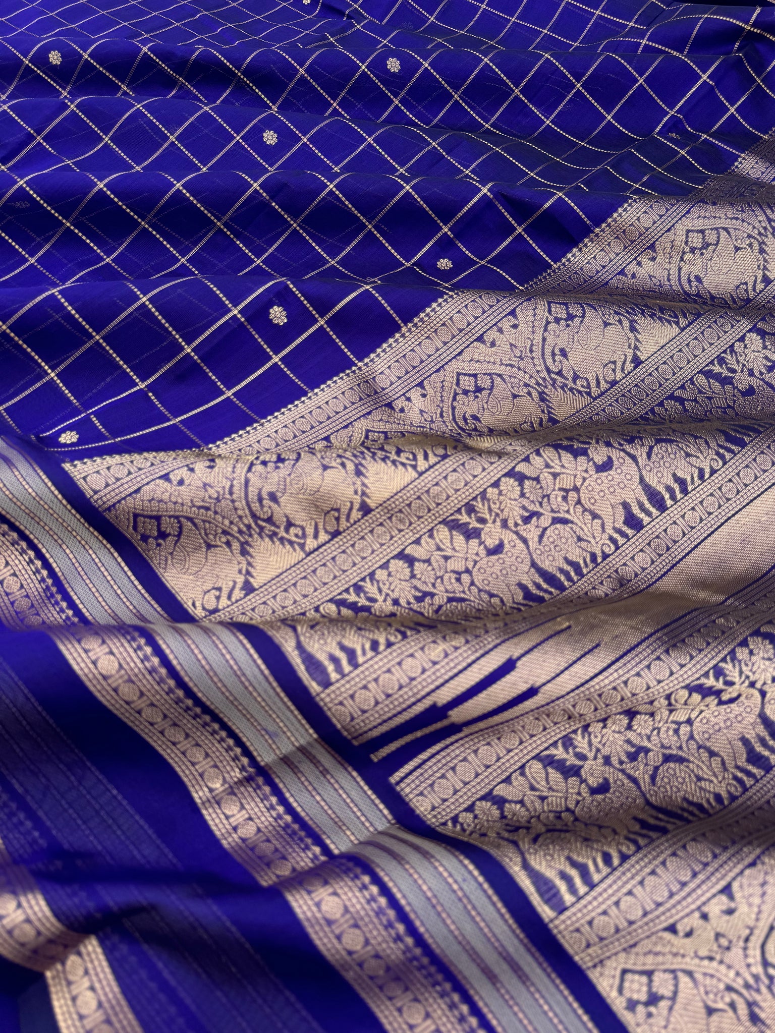 Zari Kissed Silk Cotton - a deep dark ink blue muthukattam with traditional moopula woven borders