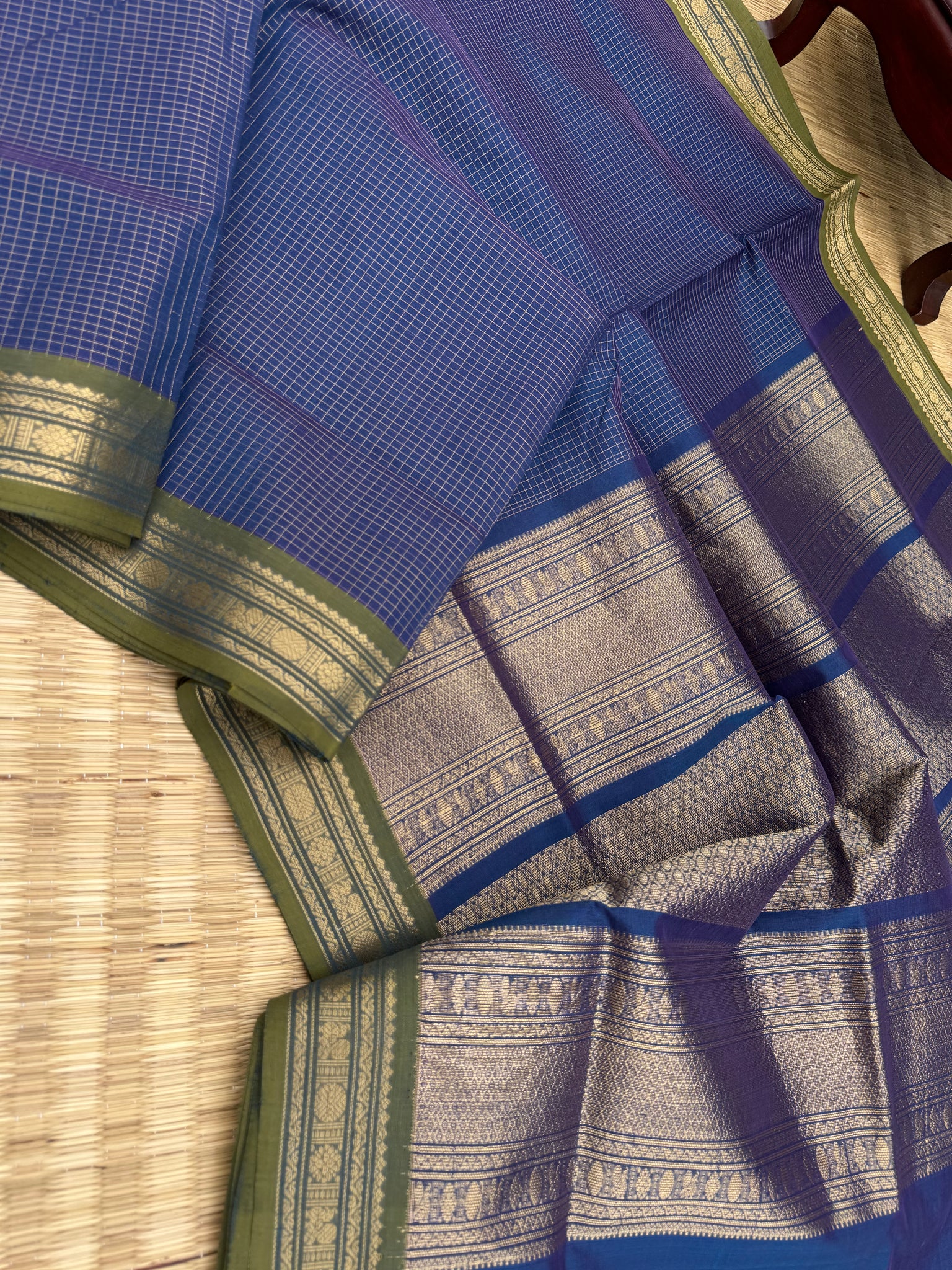 Zari Kissed Silk Cotton - a stunning two tone burnt blue oosi kattam with small borders