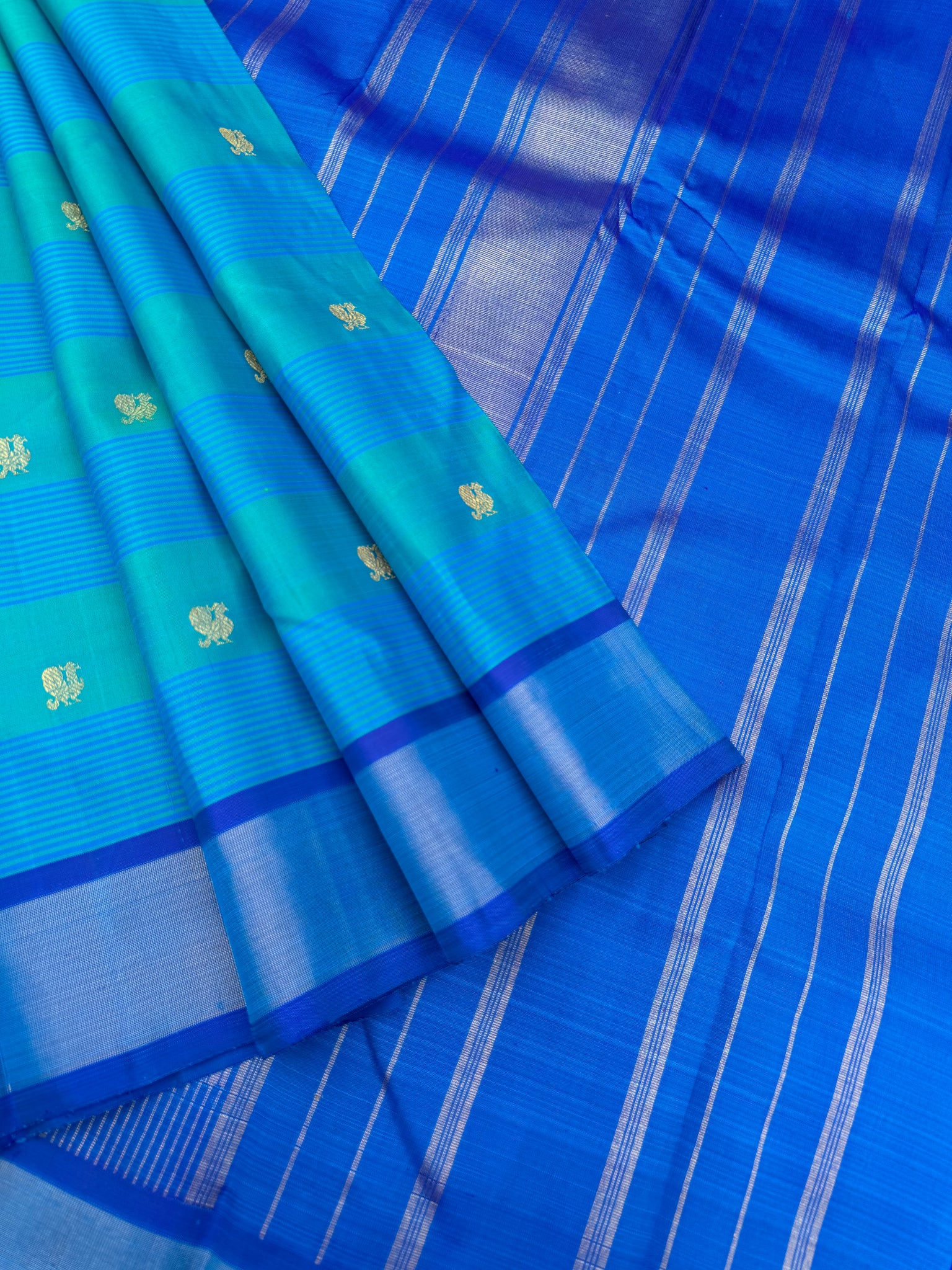 Album Untouched - a gorgeous teal and ananda blue body with mayil chackaram woven buttas