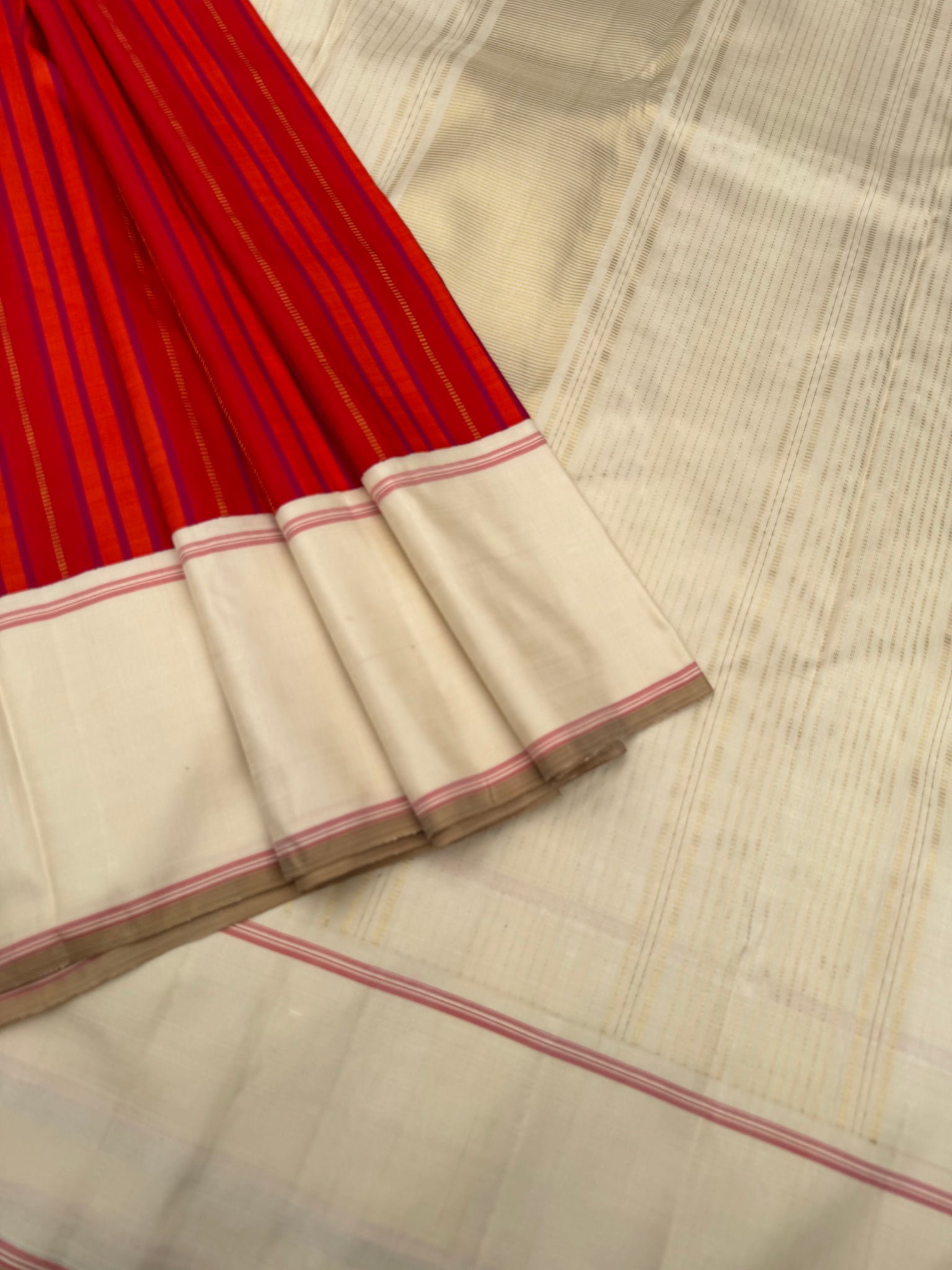 Album Vidhyasam - stunning red and ivory Korvai Kanchivaram with zari and silk stripes woven body