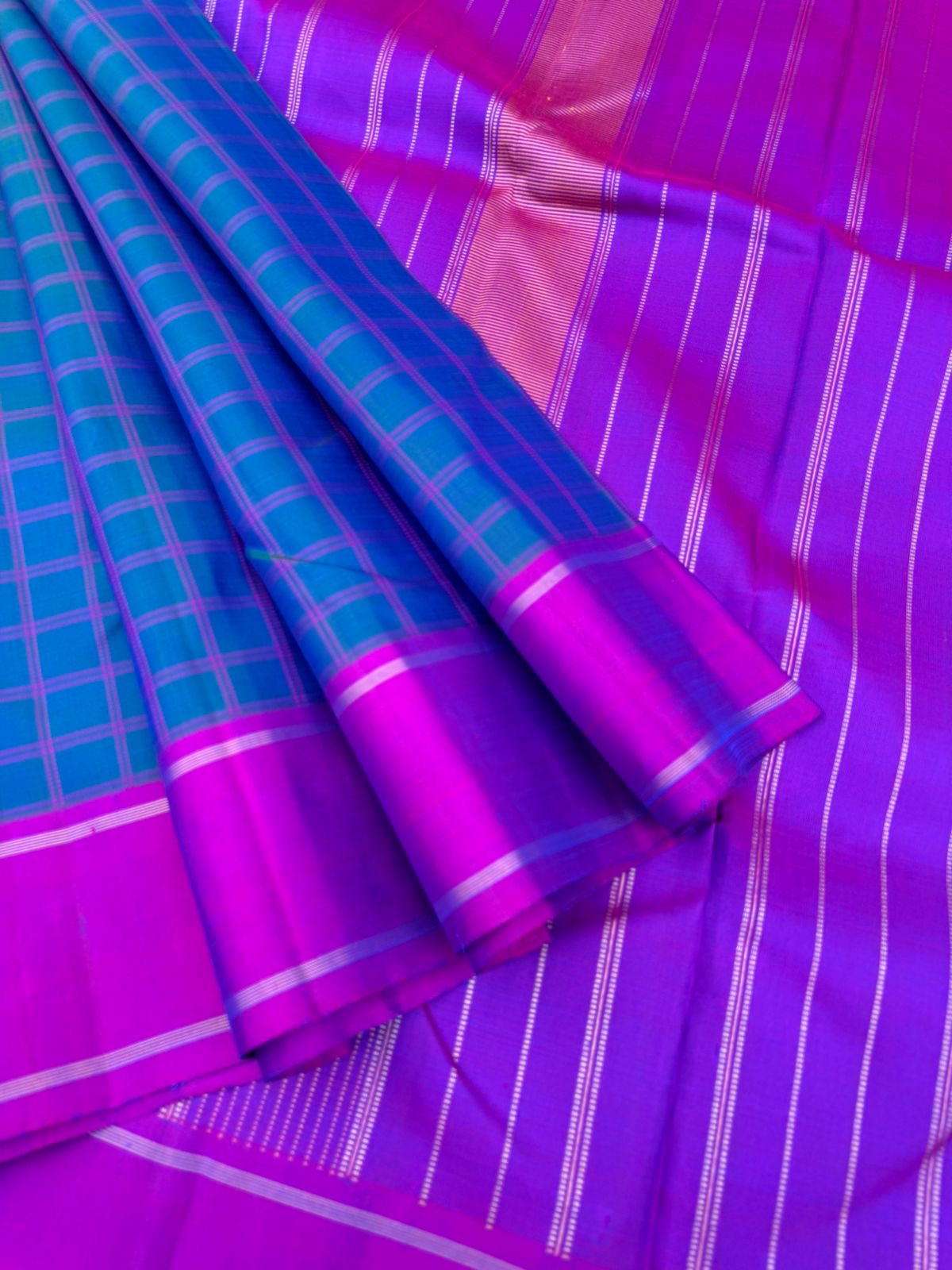 Colour Play on Kanchivaram - Simple and elegant peacock blue and violet kattam kanchivaram