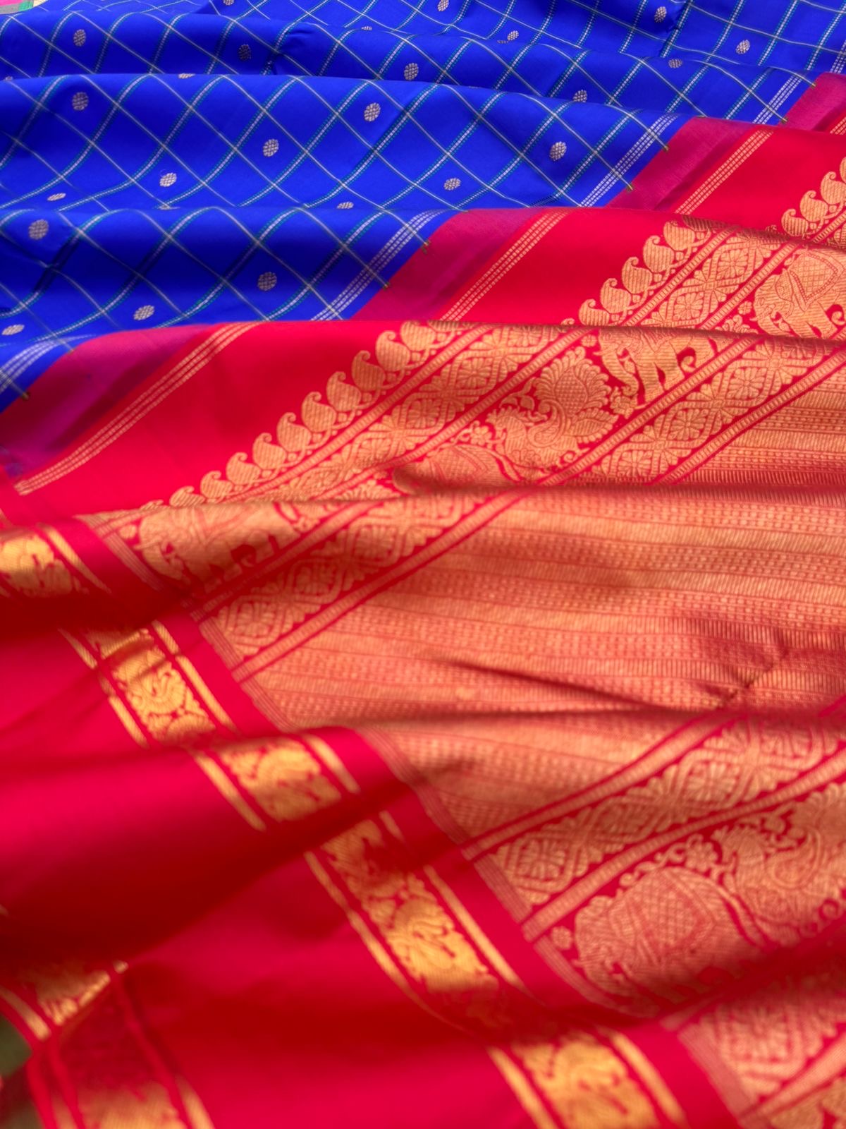 Colours of Navarathri 2025 on Kanchivarams - the best of beat blue and red Korvai Kanchivaram with chex buttas woven body