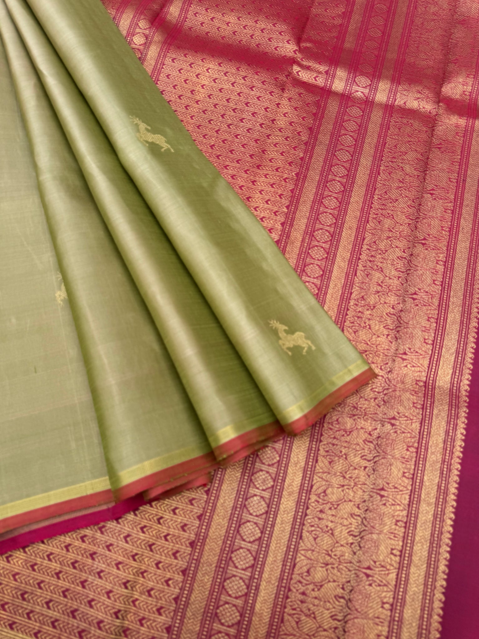 Corporate Kanchivarams - a pale elachi green and maroon borderless Kanchivaram with maan ( deer ) woven buttas