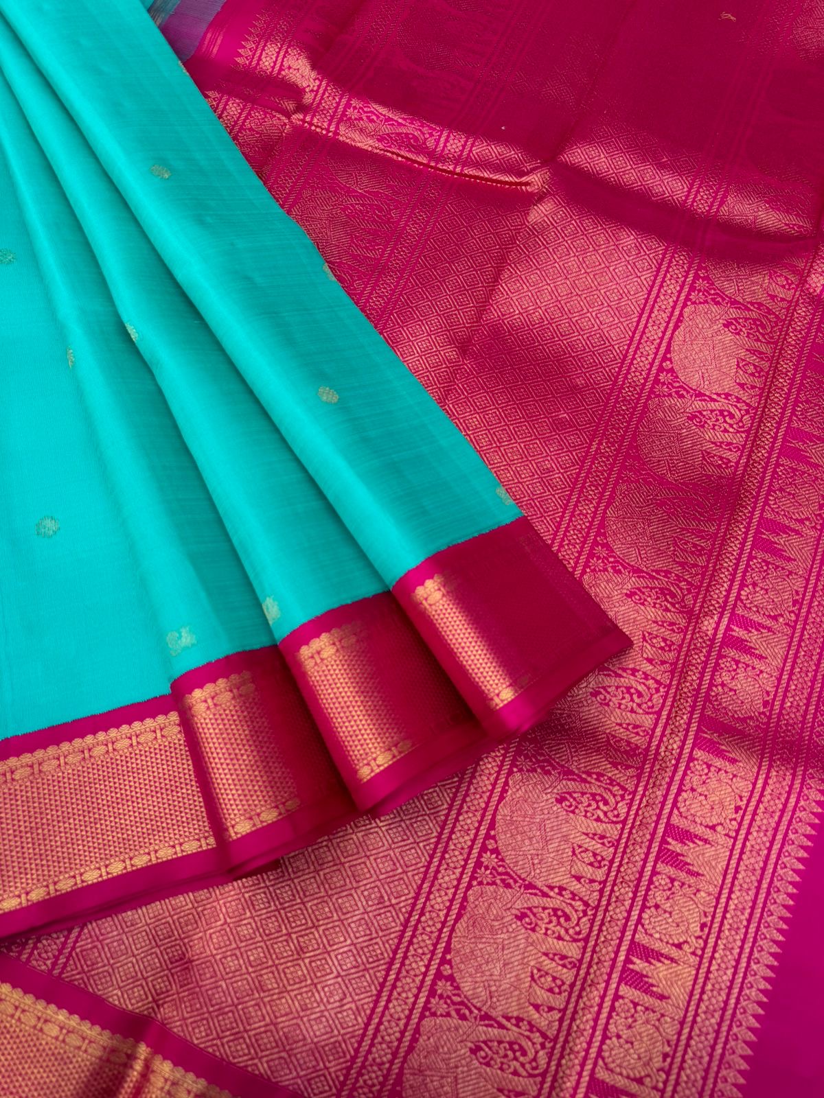 Kamakshi - Heirloom Korvai Kanchivaram - gorgeous turquoise blue and pink with aarai maadam woven borders
