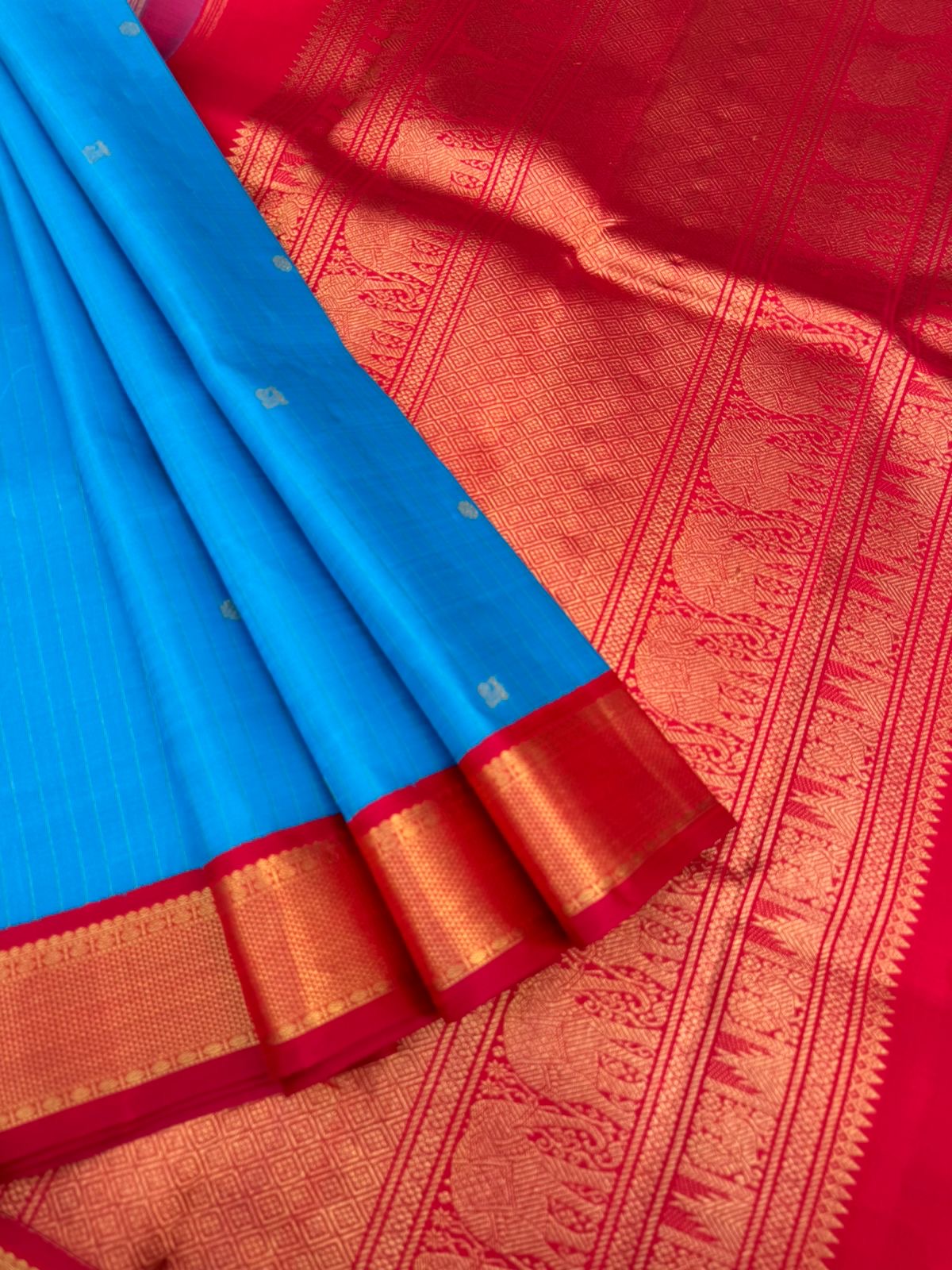 Kanchivaram Trunk - gorgeous Anandha blue and red with vertical zari strips and buttas with aarai maadam woven borders
