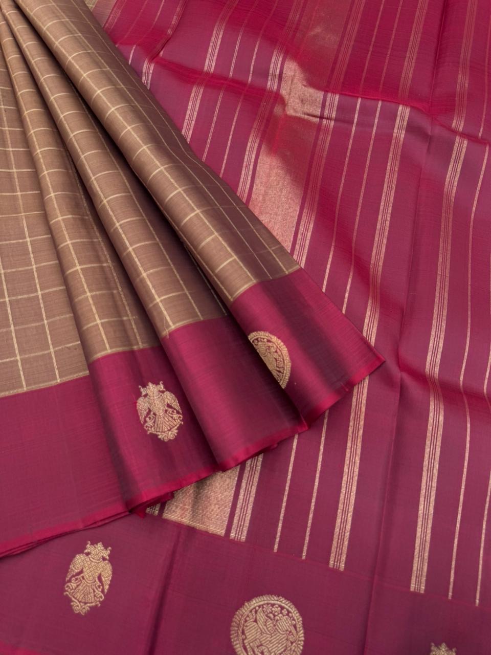 Kanchivaram Trunk - stunning chocolate brown tone chex body with aarku woven border buttas with yali and irruthalaipakshi borders