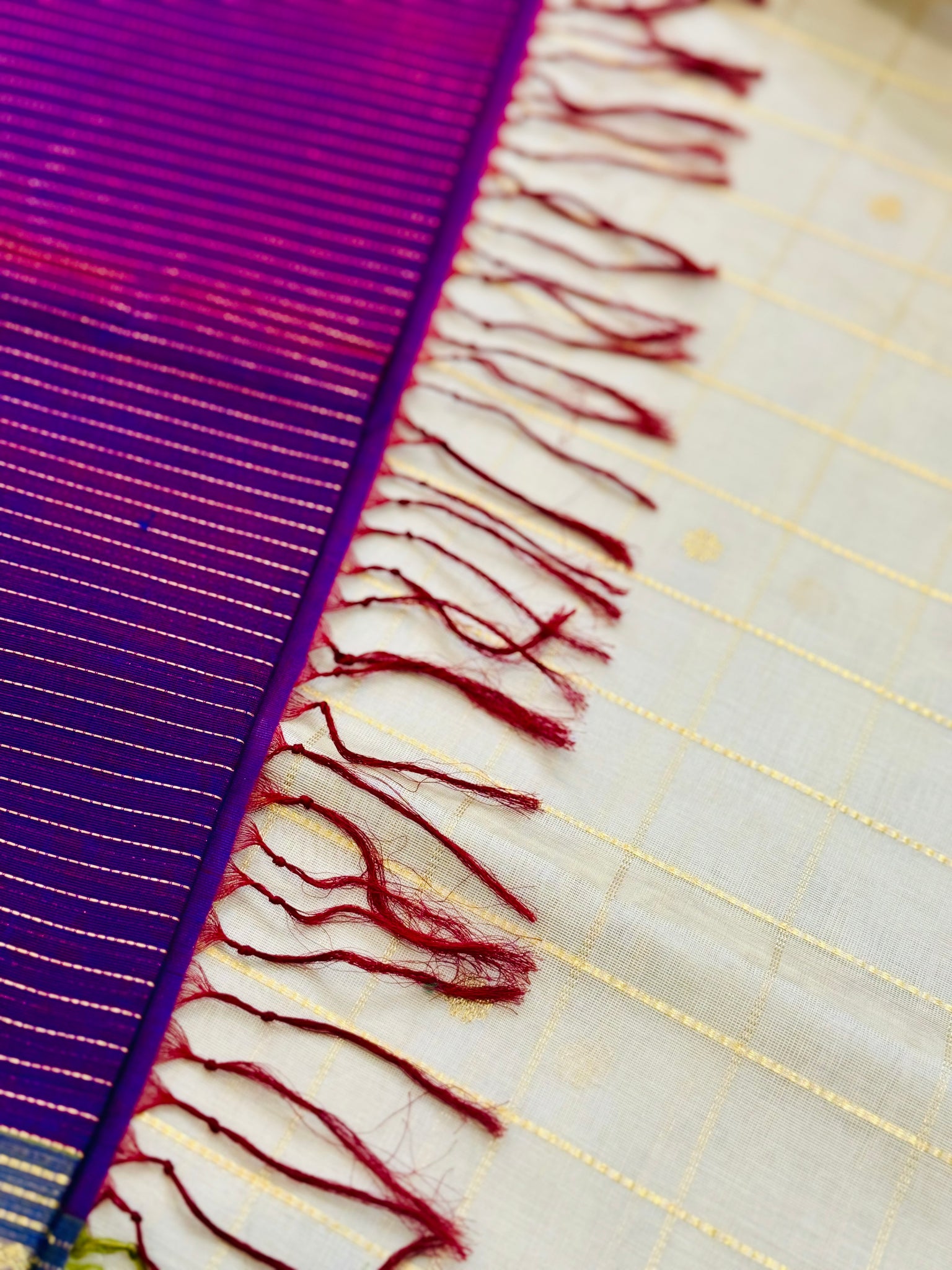 The Silk cottons from the Chettinad Handloom is always a super hit. Yes the silk cotton from chettinad Handloom is a perfect blend of pure silk yarn with pure cotton yarn on 60(Silk) : 40(cotton) ratio. These sarees are woven with korvai technique where the borders is woven separately and body woven separately with interlocking weaving technique to get the distinct solid colour borders. The body is silk cotton with pure sikk woven korvai border.