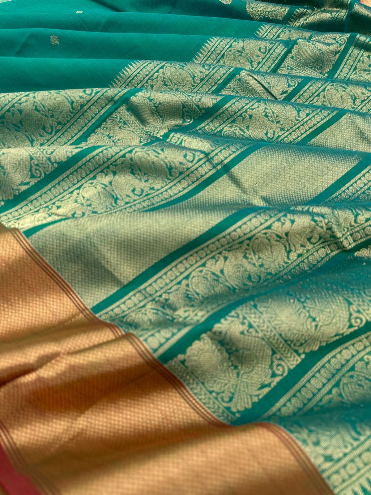 Zari Kissed Silk Cotton -deep teal blue/green corner buttas with solid borders, everyone will say you are wearing a silk saree