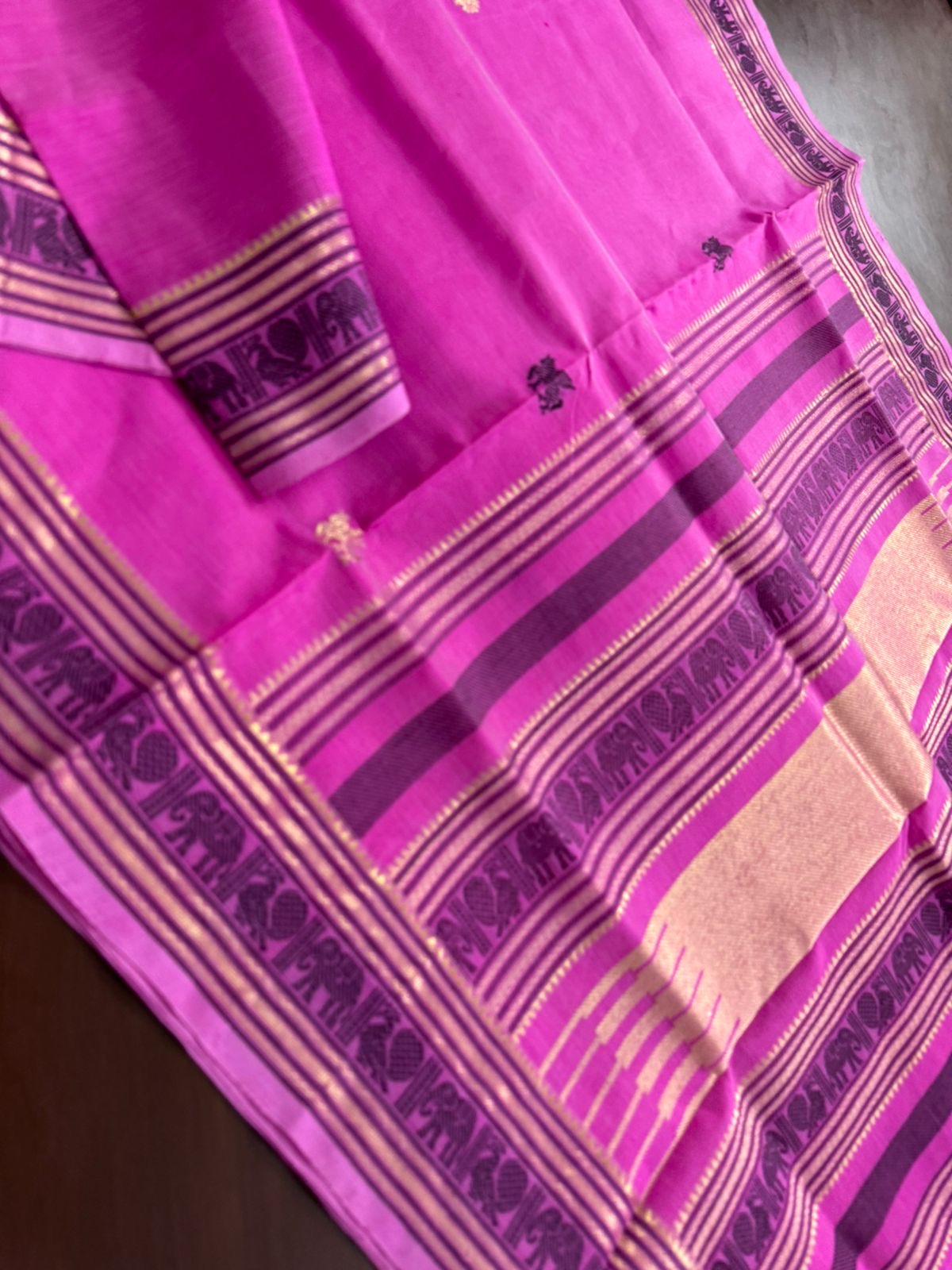 The finest Silk by cotton has a look of pure silk and comfort of cotton. These silk cotton has more of silk and less of cotton ( 60:40 ) ratio. This Makes the saree more finer and easy to carry. And this type of purest silk cotton are rare to find elsewhere.