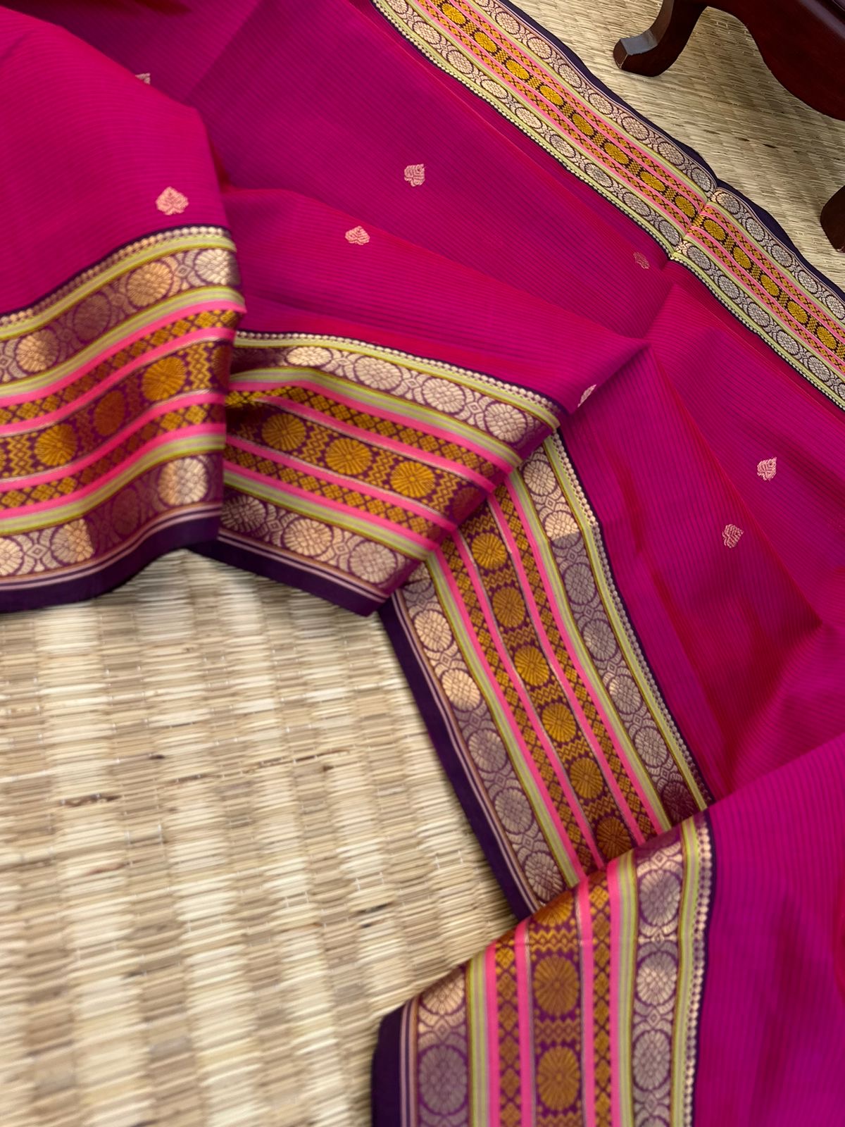 Zari Kissed Silk Cotton - deep dark pink with three row of laddu kamalam borders