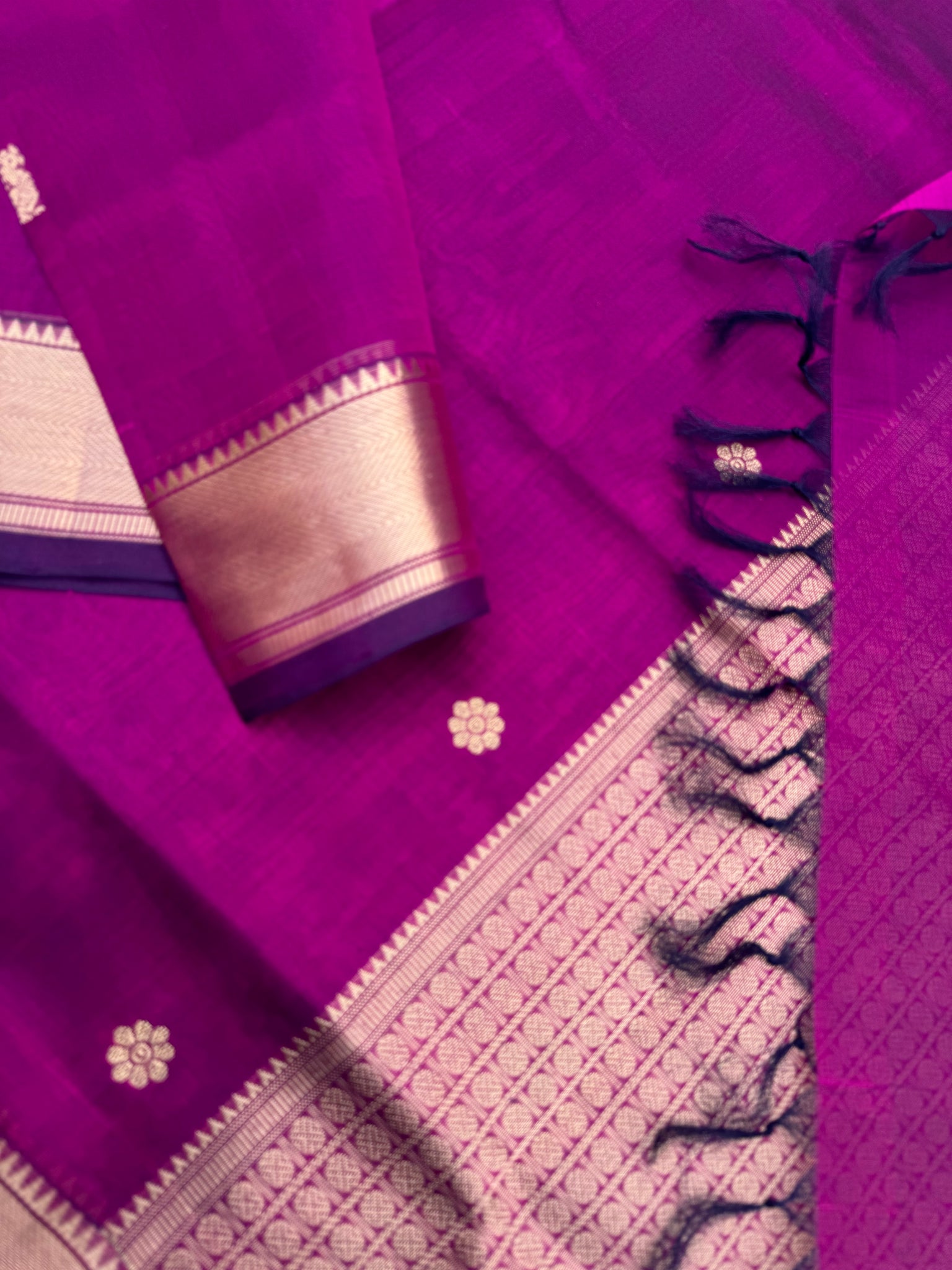 The finest Silk by cotton has a look of pure silk and comfort of cotton. These silk cotton has more of silk and less of cotton ( 60:40 ) ratio. This Makes the saree more finer and easy to carry. And this type of purest silk cotton are rare to find elsewhere.